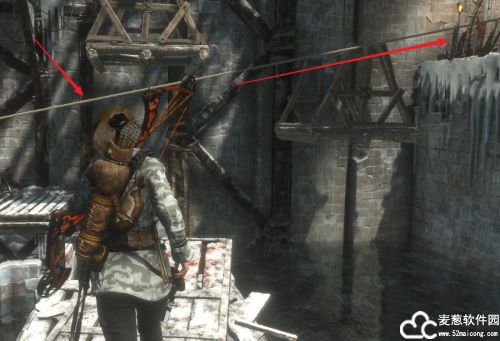 7、用绳箭相连远近两处转轮,完成后便返回一层平台中间的转轮处,但要返回到此处,就要通过方框处的平台跳到相连的线索上,攀爬回到此处,这步很关键