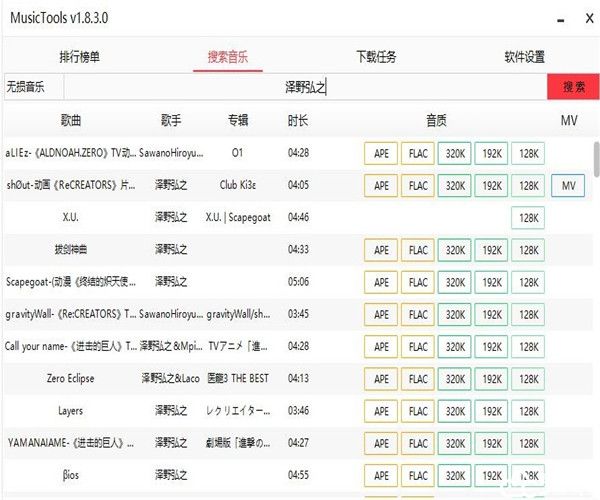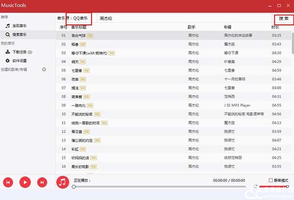 2、点击音乐源选择音乐平台,然后输入歌曲名称、歌手或者专辑点击搜索即可出现歌曲列表,右键选择下载将自动开始下载。