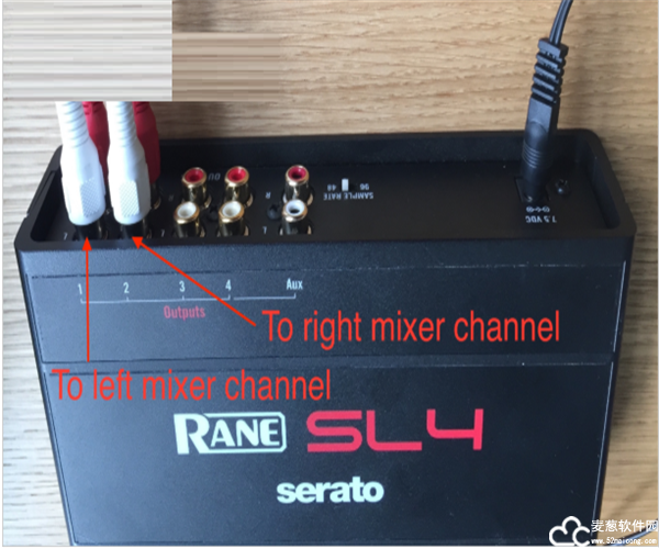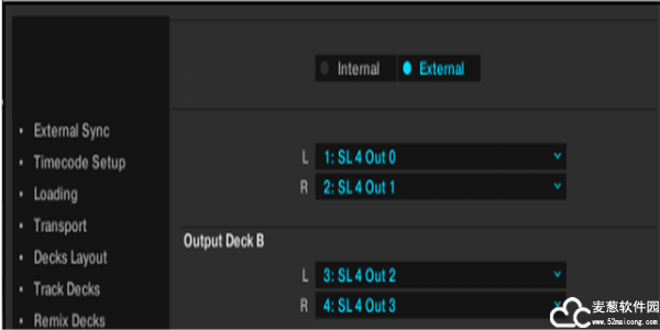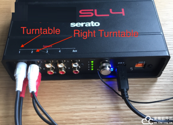 来自唱盘 A 的信号将进入音频接口的输出通道 A(SL4 输出 0-1),唱盘 B 将进入输出通道 B(SL4 输出 2-3),依此类推。