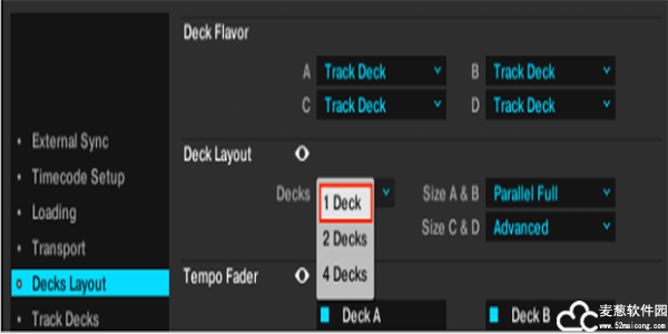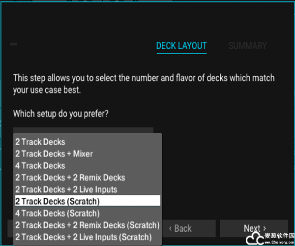 在 DECK LAYOUT SELECTION 中,请选择 2 Track Decks(Scratch)。