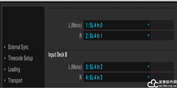 唱盘 A 将由输入通道 A 的左/右通道(SL 4 In 0-1)的时间码信号进行控制,唱盘 B 将通过时间码信号输入通道 B 的左/右通道(SL 4 In 2-3)。