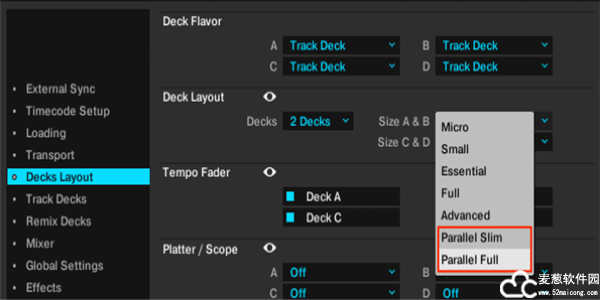 如果想要激活平行波形,请打开 TRAKTOR 偏好设置(Preferences) > Decks Layout > Decks Layout > Size A & B,然后选择其中一个 平行(Parallel)布局: