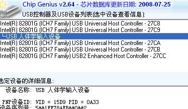 答:1、从网上下载安装好芯片精灵后,将待修复的U盘插入电脑,建议插入USB2.0的插口(USB3.0的插口内部是蓝色的)。等电脑识别后,打开ChipGenius绿色版,软件会自动识别该优盘,并显示当前USB设备列表;