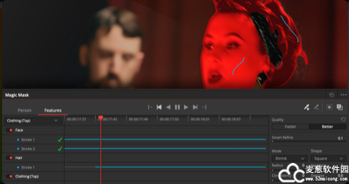 达芬奇17免费版可以选择并跟踪人物进行有针对性的调整,从未像现在这样简单!Magic Mask使用DaVinci Neural Engine神经网络引擎,能自动在人物全身或脸部和手臂等特定部位创建遮罩。它提供蒙版微调工具,可用来添加或移除画笔涂抹功能并进行自动跟踪!