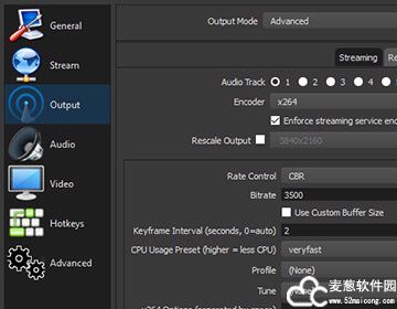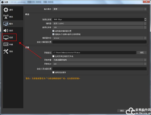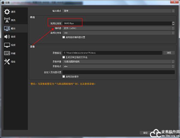 3、进入OBS Studio中文版输出设置界面后,点击【视频比特率】旁边的输入框将视频比特率设置为【3600以上】(理论上该值越高越好