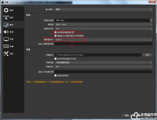 4、勾选"启用高级编码器设置",然后再找到下方的【编码器预设】设置,将其设置为【slower】