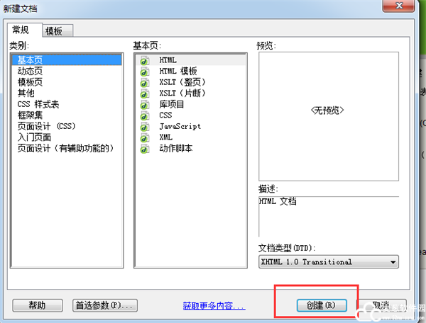 2、在打开的新建窗口中,选择您要创建的文件类型,选择完成后点击创建就可以了。