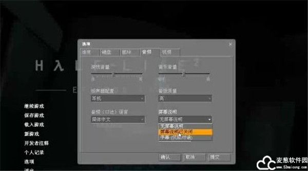 5、选择“音频”,在“屏幕说明”选项中选择“屏幕说明已关闭”,这样不但游戏对话有字幕,在游戏进行中一些发生的事情也会显示中文描述。