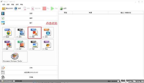 1、第一步:选择你想要转换成的格式。以要转换成“PNG”格式为例,打开格式工厂官方版后,点击“PNG”