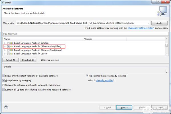 3、在name里选择“Babel Language Packs inChinese(Simplified)”简体中文选择项,点击next