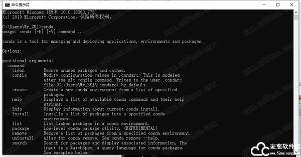 10、验证软件是否安装完成,需点击开始菜单输入cmd即可打开命令行窗口,然后输入conda,出现如下界面则表示Anaconda破解版,安装成功了