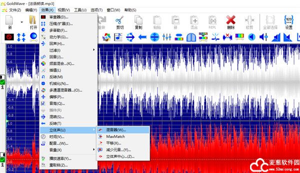 点击主菜单中的“效果”,在“立体声”中选择“混音器”,单击打开。关于立体声的详细信息,请参考:立体声命令详述。