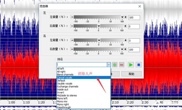 在混音器的窗口中选择预设情形,这里我们需要消除人声,所以就选择“Cancel vocals”,中文就是消除人声的意思。然后点击”OK“按钮即可。