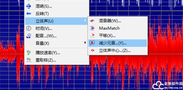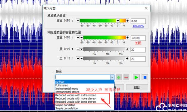这里还有一种方式,就是在第二步中,在“立体声”中选择“减少元音“。这里大家可能不明白什么是“元音”,“元音”其实就是音乐中有一个歌手表现的部分,说白了就是人声部分。