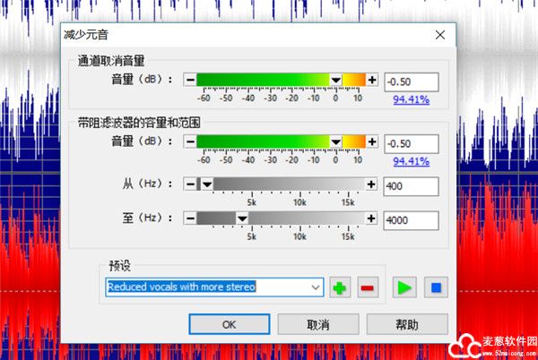 这里我根据需要选择了“Reduce vocals with more stereo”,也就是减少更多立体元音,选择之后,上面的所以参数都会自动调整至预设设定的值,然后我们点击”OK“按钮即可。