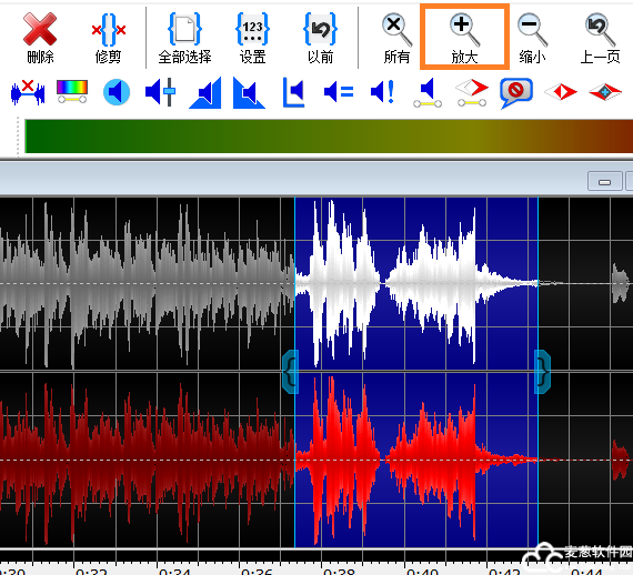 我们先在软件中找到需要保留的部分,大概在哪个位置,然后点击上方的“剪刀”,把这一段截取下来。这里有一个小细节,如果你需要的那段音频非常短,可以点击主页面上方的“放大”键,放大波形哦!截取音频之后,点击上方的“剪切”。