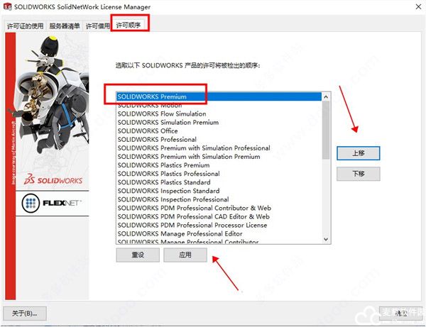 9、运行软件,依次打开帮助> SolidNetWork License Manager >许可顺序,将Premium产品移动到Professional和Standard之上,点击应用并确定,重新启动;