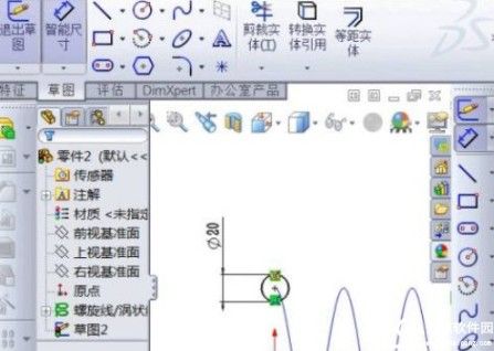 5、在这个面上绘制草图,点击正视,在螺旋线的起始点画一个直径为20mm圆,并标注尺寸;
