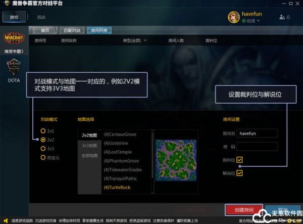 1、在魔兽争霸官方对战平台官方版中,房间列表模式,你可以添加AI或者与好友约战。但在房间列表模式中,你无法得到任何收益。