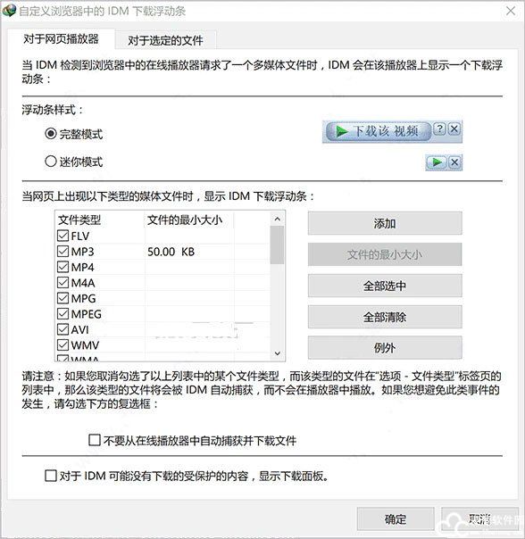 在设置窗口,你还可以指定特定站点显示或隐藏软件的下载浮动条等更多自定义操作。