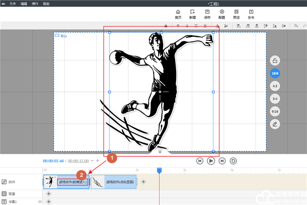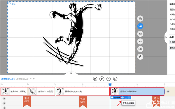鼠标单击时间轴右侧“+动作”按钮->在新窗口中选择“清场动作”->选择合适的清场动作动画->“确认”保存设置。