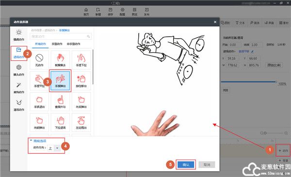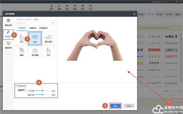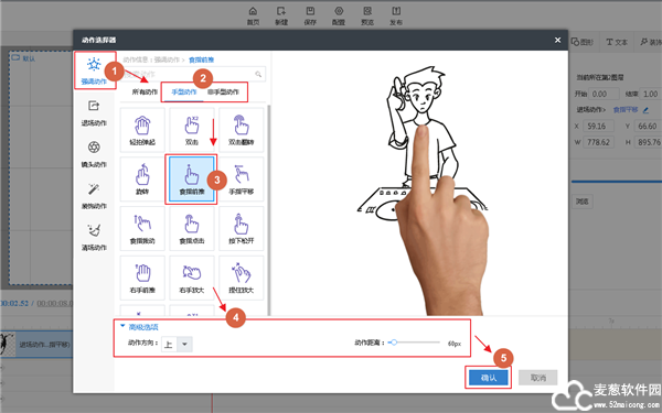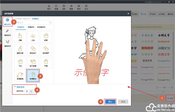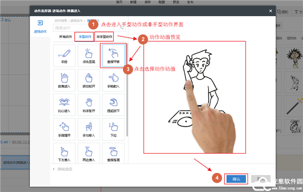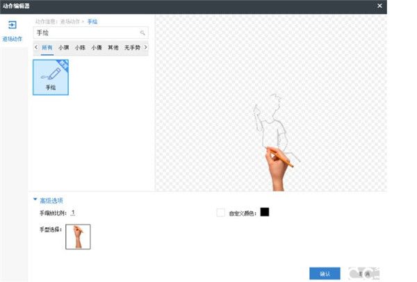 2、在弹窗中选择合适的手型动作或非手型动作动画->自定义动作动画的高级选项->点击“确认”按钮。