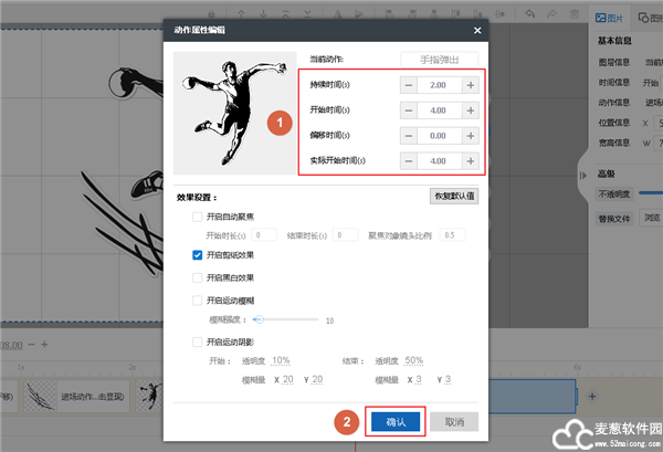2、可自定义动作动画的持续时间、开始时间、偏移时间及实际开始时间,点击“确认”按钮保存设置。