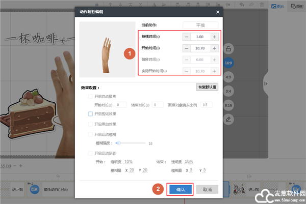 3、设置镜头动作属性,如持续时间、开始时间、偏移时间及实际开始时间->点击“确认”