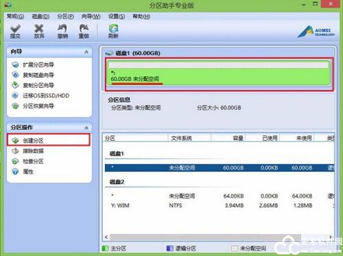 2、接着在打开的界面,点击左侧面板中的“创建分区”按钮,开始为硬盘创建分区