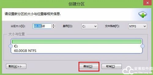 2、接下来我们就进入到创建分区的界面,如下图所示,我们在界面中可以设置盘符、文件系统以及空间大小等信息如果你是小白,那么按照它默认的选项不用修改就可以了,设置完成后我们点击确定