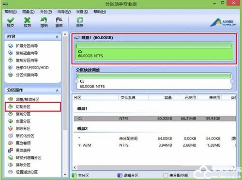 4、分区创建完成,选中刚才新建的分区,点击分区操作下面的“切割分区”(由于C盘正常情况都是作为系统盘,所以建议用户们为C盘分配60-100G)