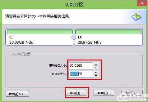 5、设定好原始分区的大小跟新分区的大小,然后点击“确定(O)”