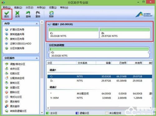 6、分割完成之后,点击左上角的“提交”按钮(想要进行更多分区创建的用户可以利用以上的方法继续对硬盘进行分割分区)。