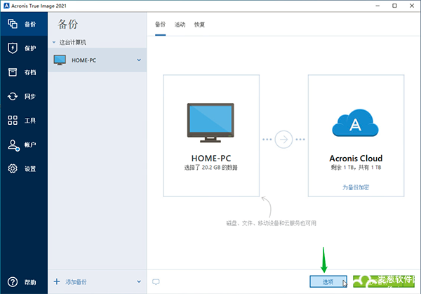 7、单击“选项”以设置备份选项,包括计划,方案,存档清理等