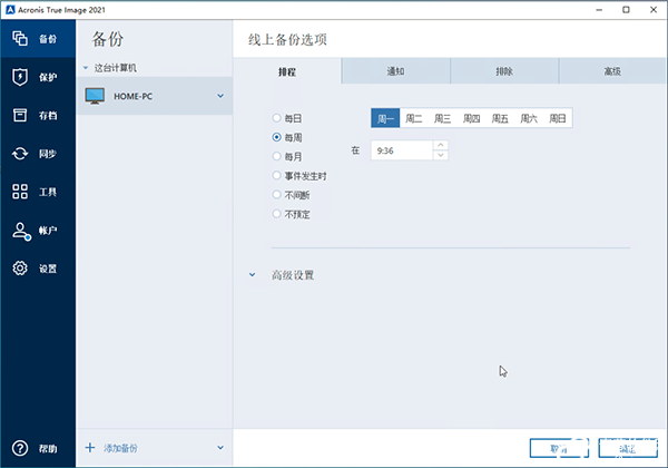 8、我们建议您设置计划或创建系统的定期备份。如果选择“不安排”选项,则每次使用“立即备份”按钮 时都需要手动运行Acronis True Image 2021中文版备份任务