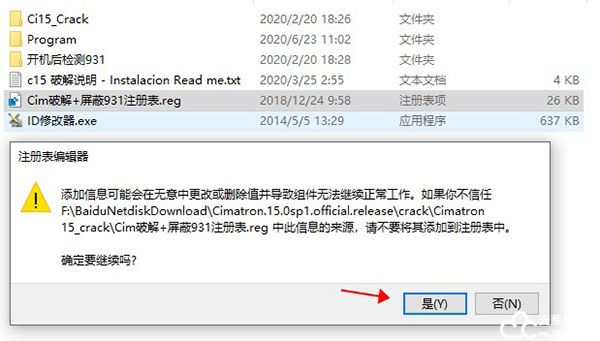 1、下载解压,得到Cimatron15汉化版源文件和破解补丁,运行Cim破解+屏蔽931注册表.reg