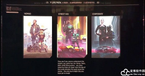 游戏中,玩家有3种发展模式可以选择,也就是所谓的人生道路(背景),不同背景带来了不同的初始游戏区域和基本人物设定。三项人生道路为:游猎(Nomad),市井(Street Kid),企业(Corporate)