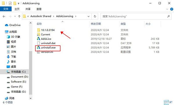 4、打开路径C:Program Files (x86)Common FilesAutodesk SharedAdskLicensing,点击uninstall.exe把v10版本卸载干净,重启电脑