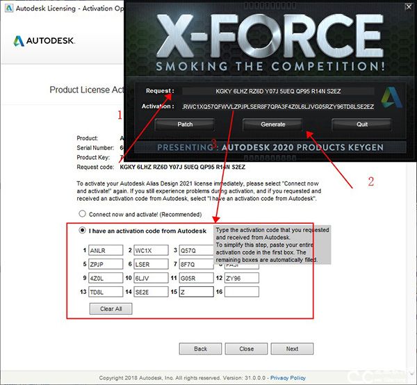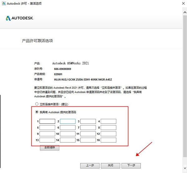 13、这里将申请号复制到注册机request中,再点击generate得到激活码,再将激活码复制到软件注册框中,点击下一步即可激活