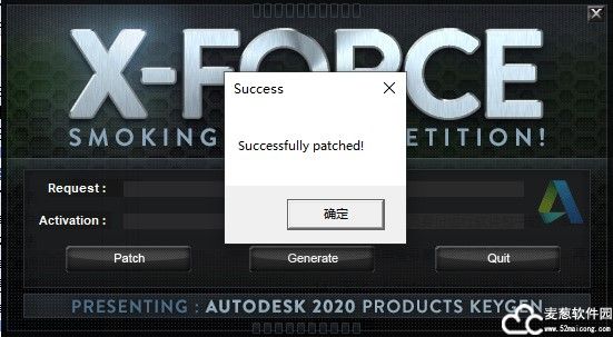12、这时以管理员身份运行软件包中的“xf-adesk20_v2.exe”文件打开注册机,首先一定要先点击patch,弹出“successfully patched”才能进行下一步
