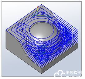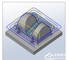 Pocket是有效清理大量材料的传统粗加工策略。该零件逐层清除,具有平滑的偏移轮廓,Autodesk HSMWorks Ultimate 2021破解版在整个操作过程中保持爬铣。为避免插入,工具沿着水平线之间的螺旋路径向下倾斜。为了保持高进给率,从而减少加工时间,通过平滑工具运动避免了方向的急剧变化