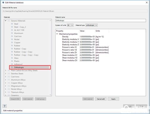 现在支持正交各向异性材料。这些材料的材料属性沿着相互正交的轴不同。您可以通过选择直生的材料类型
