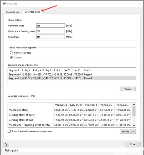 您可以通过上的拾取信息选项卡访问线性化应力函数分析工作台。您可以绘制垂直于曲面的应力线性化线段,或者通过拾取线段的端点来定义它们