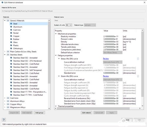 材料数据库现在支持正交各向异性材料特性和疲劳材料曲线。在疲劳特性下,应力-寿命和应变-寿命曲线都是受支持的。您可以从UTS估算疲劳特性,用斜率法输入它们,或者从。战斗支援车(combat support vehicle的缩写)文件。