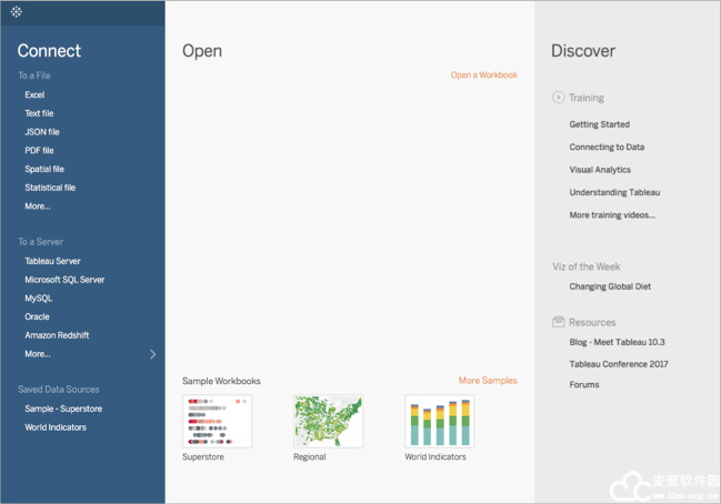 步骤 1:连接到地理数据地理数据有许多形状和格式。打开Tableau Desktop 2021破解版时,开始页面将在左侧“连接”窗格中显示可用的连接器。您将通过这些连接器来连接到数据。可通过连接到空间文件来处理地理数据,或者可以连接到存储在电子表格、文本文件中或服务器上的位置数据。空间文件(例如 Shapefile 或 geoJSON 文件)包含实际几何图形(点、线或多边形),而文本文件或电子表格包含经纬度坐标格式的点位置,或者包含在引入时将连接到地理编码(数据引用的存储几何图形)的指定位置。有关支持的连接的完整列表,请参见网站上的数据连接(Link opens in a new window)列表