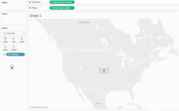 该“Country”(国家/地区)字段将添加到“标记”卡上的“详细信息”,而“纬度(生成)”和“经度(生成)”字段将添加到“列”和“行”功能区。系统会创建一个具有一个数据点的地图视图。由于为“Country”(国家/地区)分配了地理角色,因此Tableau Desktop 2021破解版将创建地图视图。如果双击任何其他字段(例如某个维度或度量),会将该字段添加到“行”或“列”功能区或者“标记”卡,具体情况取决于视图中已有的内容。但是,地理字段始终放在“标记”卡上的“详细信息”中
