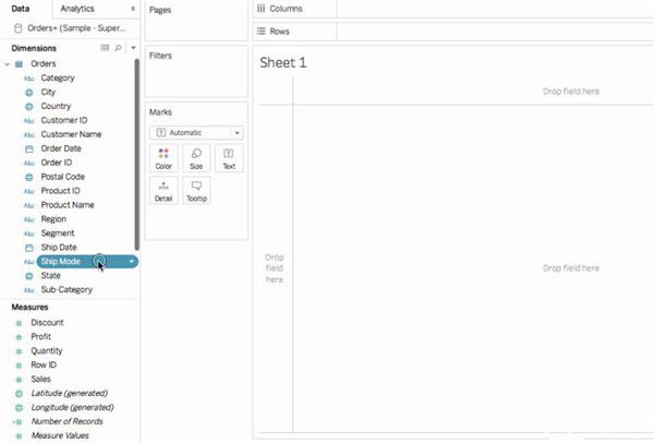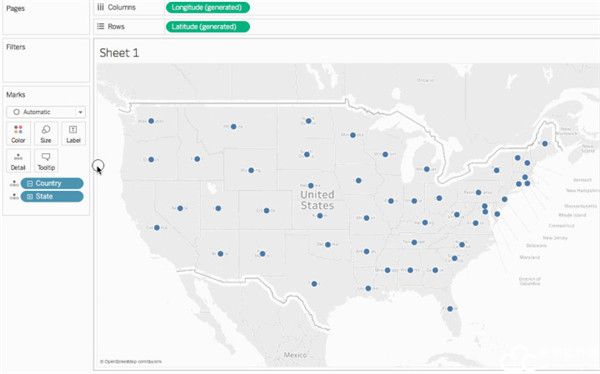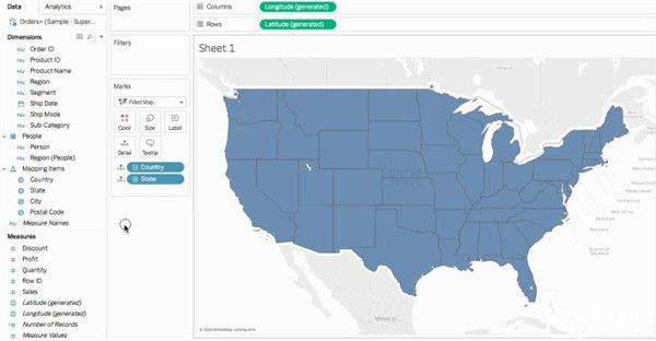 这称为工作表,您可以在其中构建地图。屏幕的左侧是“数据”窗格。数据源中的所有列以字段形式列在此窗格中。例如,“Country”(国家/地区)和“State”(州/省/市/自治区)。这些字段包含列中的所有原始数据。请注意,Tableau Desktop 2021破解版已生成纬度和经度字段:“纬度(生成)”和“经度(生成)”这是因为您为数据分配了地理角色