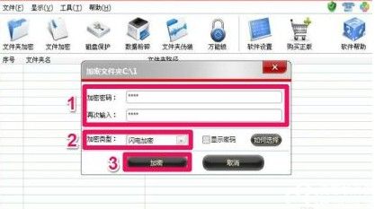 方法二:运行文件夹加密超级大师完美破解版,点击软件窗口上的【文件夹加密】按钮,然后在弹出的窗口中选择需要加密的文件夹,点击“确定”。然后在弹出的文件夹加密窗口中设置加密密码,选择加密类型,然后点击“加密”。