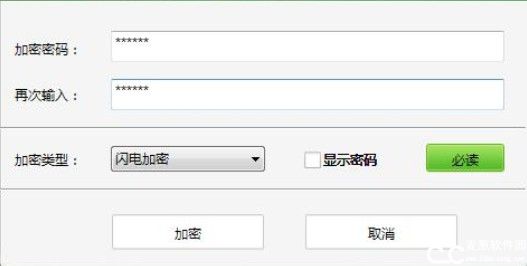 3、先两次输入同样的密码,然后选择“加密类型”,建议“闪电加密”,之所以用这个简单的加密方式,是希望大家先充分熟悉这个软件后,再去用其它高强度加密方式。