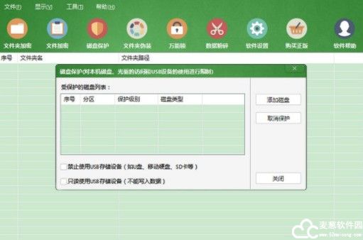 点击软件窗口上方的【磁盘保护】按钮,在弹出的磁盘保护窗口点击“添加磁盘”,然后在添加磁盘窗口选择需要保护的磁盘以及保护级别,点击“确定”就可以了。磁盘保护分为初级、中级和高级保护,您可以根据具体需要选择保护级别。